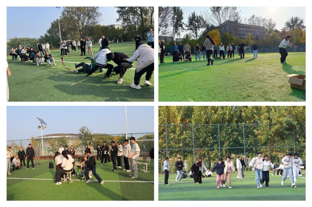 本次趣味运动会比赛分为螃蟹背西瓜、筷子夹乒乓球、抢椅子、拔河四个项目。随着发令哨声响起,10支师生混编队伍即刻投入角逐,队员们调整节奏、协作配合,赛场上洋溢着紧张又欢乐的氛围。拔河比赛更是将气氛推向高潮,年长教师的沉稳与青年学子的爆发力完美融合,加油助威声如潮水般此起彼伏,在足球场上空久久回荡,尽显活力与朝气。