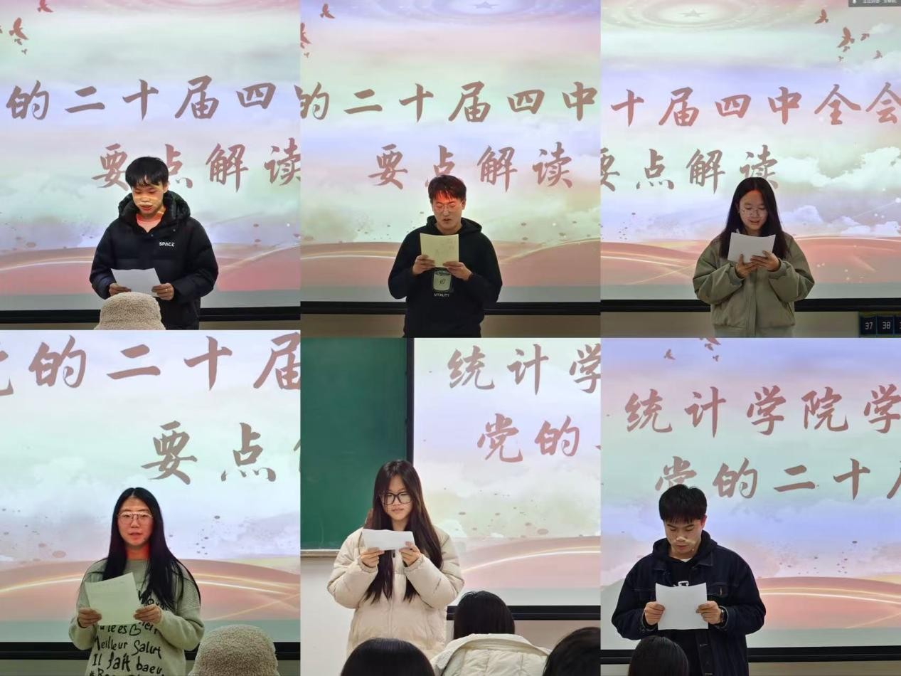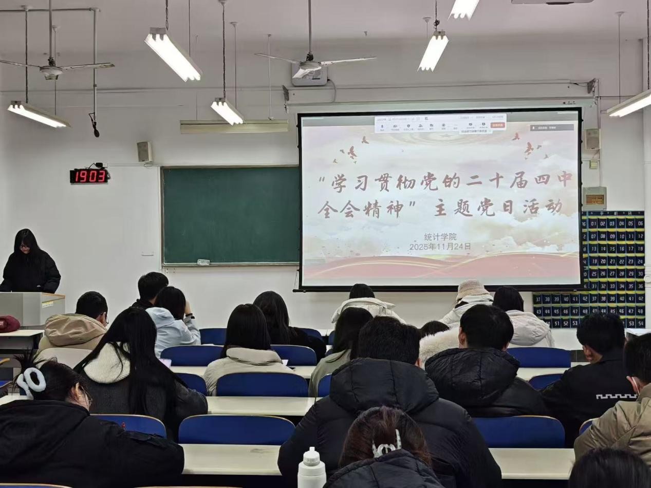 为引导全体党员将思想和行动统一到中央的最新决策与部署上来,深入学习领会、全面贯彻落实党的二十届四中全会精神,11月11日,统计学院在5301举办“学习全会精神、凝聚奋进力量”主题党日活动。全体学生党员参加。
